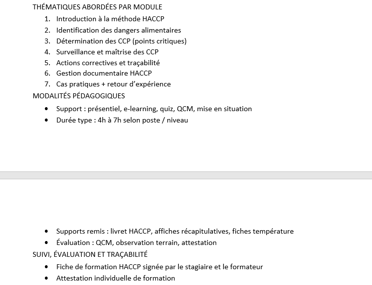 Ici, une décomposition complète et claire d’un plan de formation HACCP professionnel, conforme aux exigences légales (décret n°2011-731), structurée en 7 blocs essentiels :