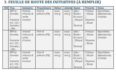 - Valeur (1–5) : impact attendu sur coûts/qualité/délais/compliance.