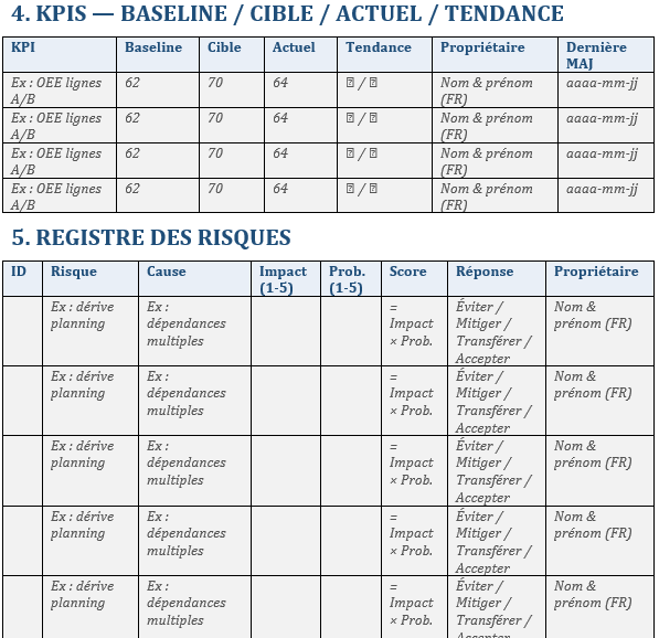 - Objectifs chiffrés (ex. -30 % lead time, -50 % erreurs)