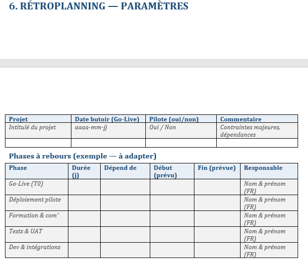 - Sorties : PV de recette, go/no go, plan d’hypercare (2–4 semaines).