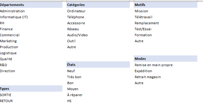 Formulaire de prêt de matériel en entreprise dans Excel + Inventaire – Mouvements – Dossiers