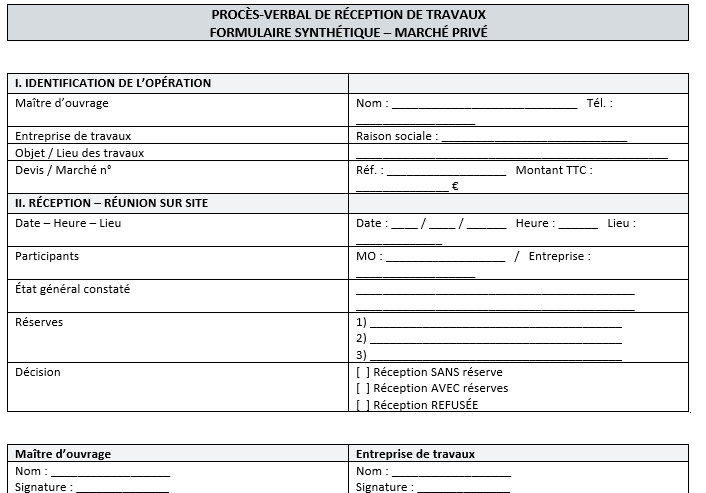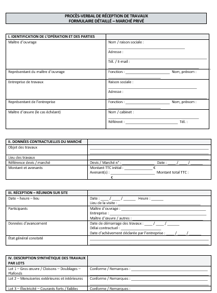 • Pour un chantier à forts enjeux (coût élevé, plusieurs intervenants, impacts assurantiels ou réglementaires), le formulaire développé offre une sécurité supérieure : chaque lot est apprécié, chaque réserve est datée, chaque rubrique rappelle les règles du jeu.