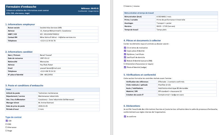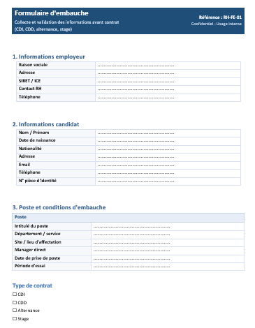 Un circuit où la paie apprend l’embauche au dernier moment produit des retards et des corrections. Le formulaire sert à aligner RH, paie et management.