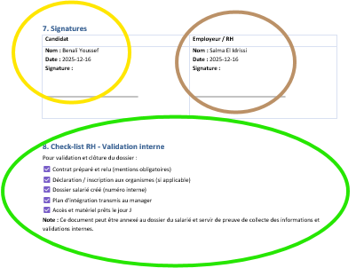 Ce bloc évite la chasse aux documents à la dernière minute. Il permet aussi de contrôler le dossier comme une équipe : RH collecte, manager confirme, paie vérifie.