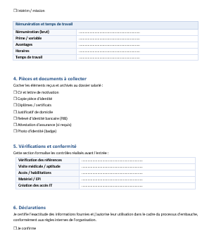 Le formulaire devient utile lorsqu’il intègre une check-list : pièce d’identité, coordonnées bancaires, justificatifs nécessaires, diplômes/habilitations si requis, attestation d’assurance selon poste, etc.