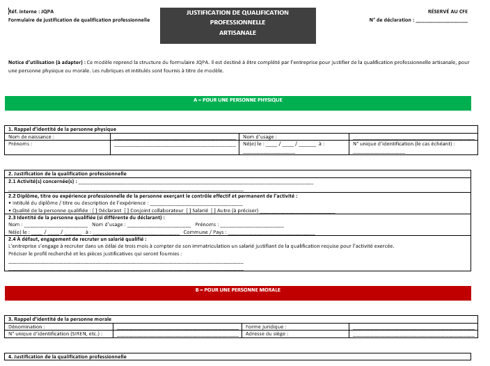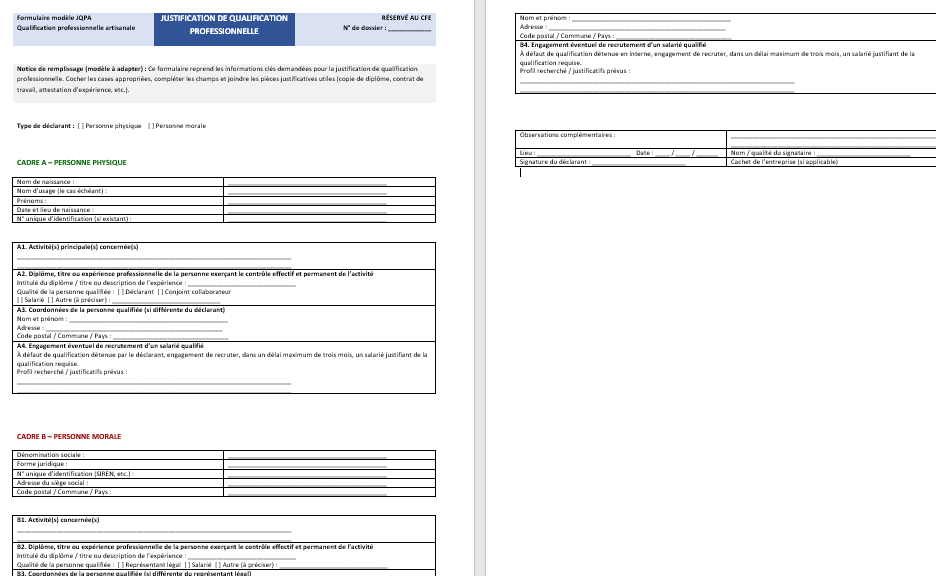 Le formulaire JQPA se divise généralement en deux grandes parties. La première se réserve à la personne physique, la seconde à la personne morale. On ne remplit que le cadre qui correspond à la situation de l’entreprise ; le reste peut être barré ou laissé vide, selon les consignes du CFE.
