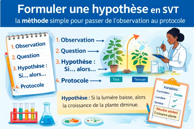 Une hypothèse est une proposition scientifique provisoire. Elle répond à une question issue d’une observation et se vérifie. En SVT, on l’utilise pour expliquer un phénomène (croissance d’une plante, digestion, respiration, activité enzymatique, etc.). L’objectif n’est pas d’avoir “tout de suite raison”, mais de formuler une idée raisonnable et testable.