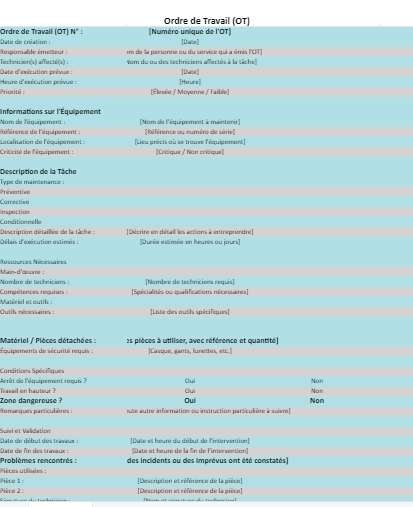 Voici un exemple structuré d’un Ordre de Travail (OT). Ce modèle peut être utilisé pour formaliser une intervention de maintenance. Il comprend toutes les informations nécessaires pour assurer une gestion claire et précise de l’intervention.