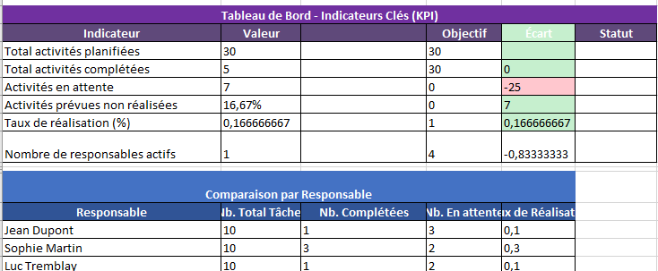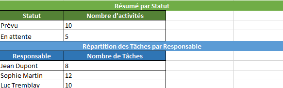 - Résumé par Statut : Nombre d’activités par statut (Prévu, En attente, Complété)