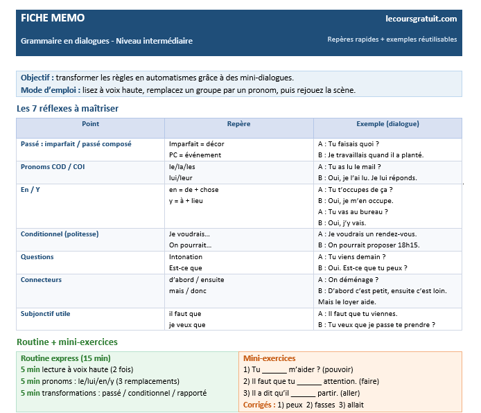 Cet article propose une méthode très concrète : apprendre la grammaire dans des dialogues courts, puis la consolider avec des transformations rapides. Niveau intermédiaire signifie ici que vous pouvez déjà tenir une conversation simple, mais vous voulez parler avec plus de précision, éviter les erreurs répétitives, et gagner en naturel.