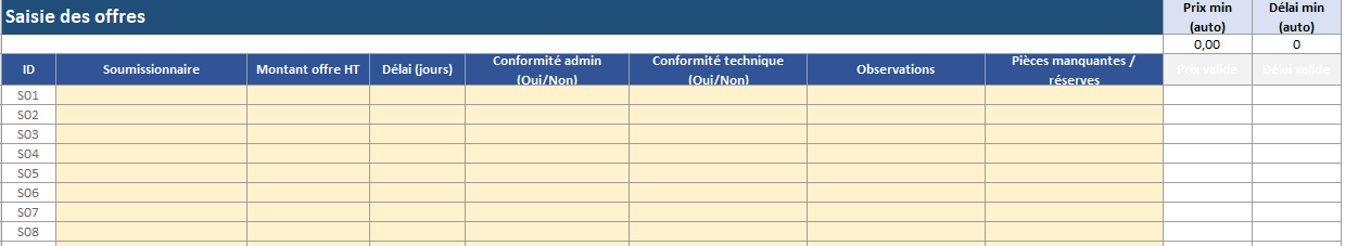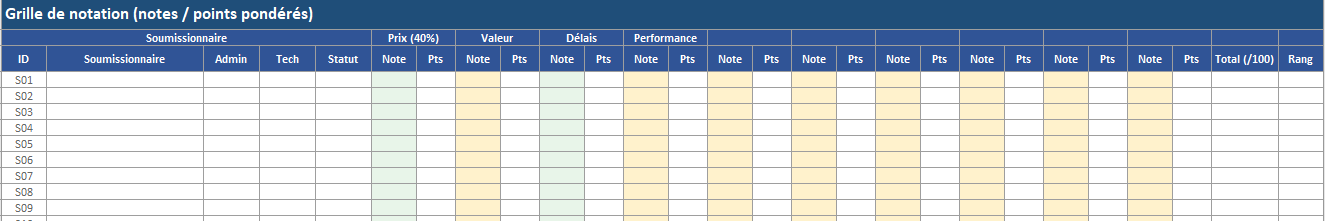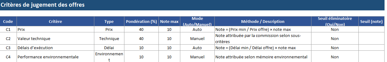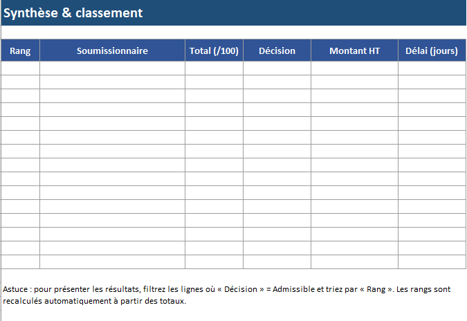 C’est le cœur : elle calcule les notes, applique les pondérations, additionne le total /100, produit le rang, et gère les décisions (élimination, sous-seuil, admissible). L’idéal consiste à automatiser tout ce qui peut l’être (prix, délai, pondérations) et à laisser en saisie uniquement ce qui exige un jugement (technique).
