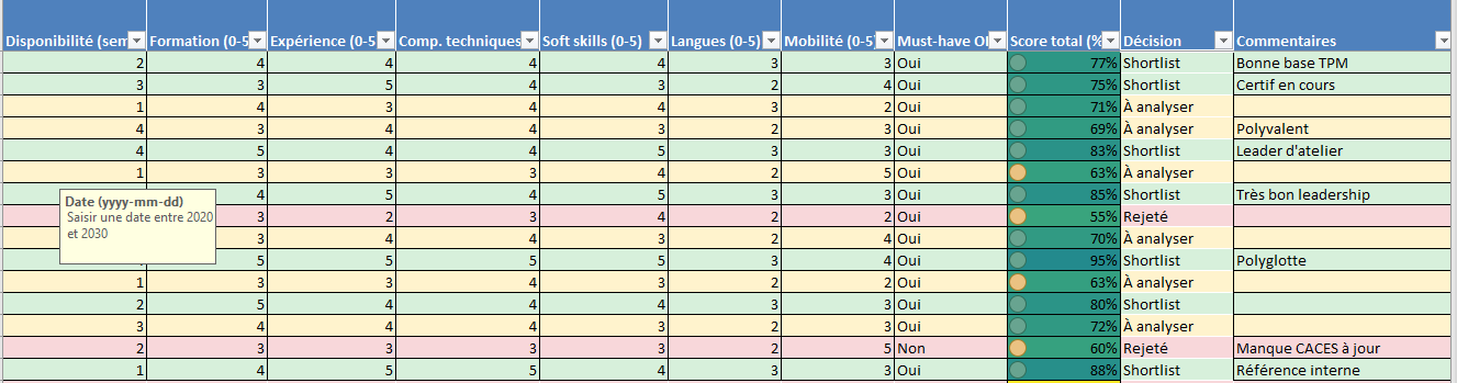 - Ligne verte = Shortlist, jaune = À analyser, rouge = Rejeté