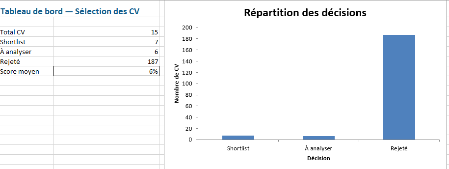 - Adapter les seuils : dans Grille_CV, modifiez les formules du Score total (si vous changez les poids) et les conditions de Décision (si vous relevez/abaissez un seuil).