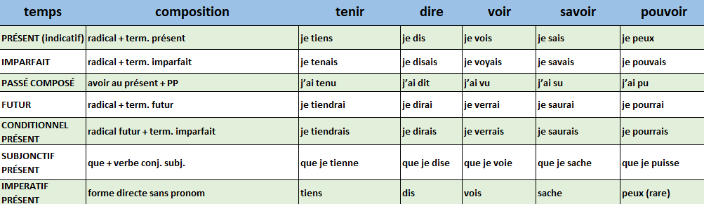 tenir, dire, voir, savoir, pouvoir - Exemples conjugués à chaque temps