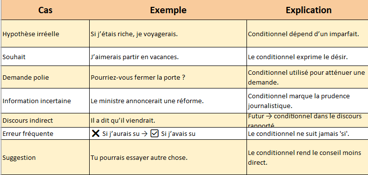 | Passé | Auxiliaire (être/avoir au conditionnel) + participe passé | J’aurais mangé. | Hypothèse non réalisée, regret. | |
