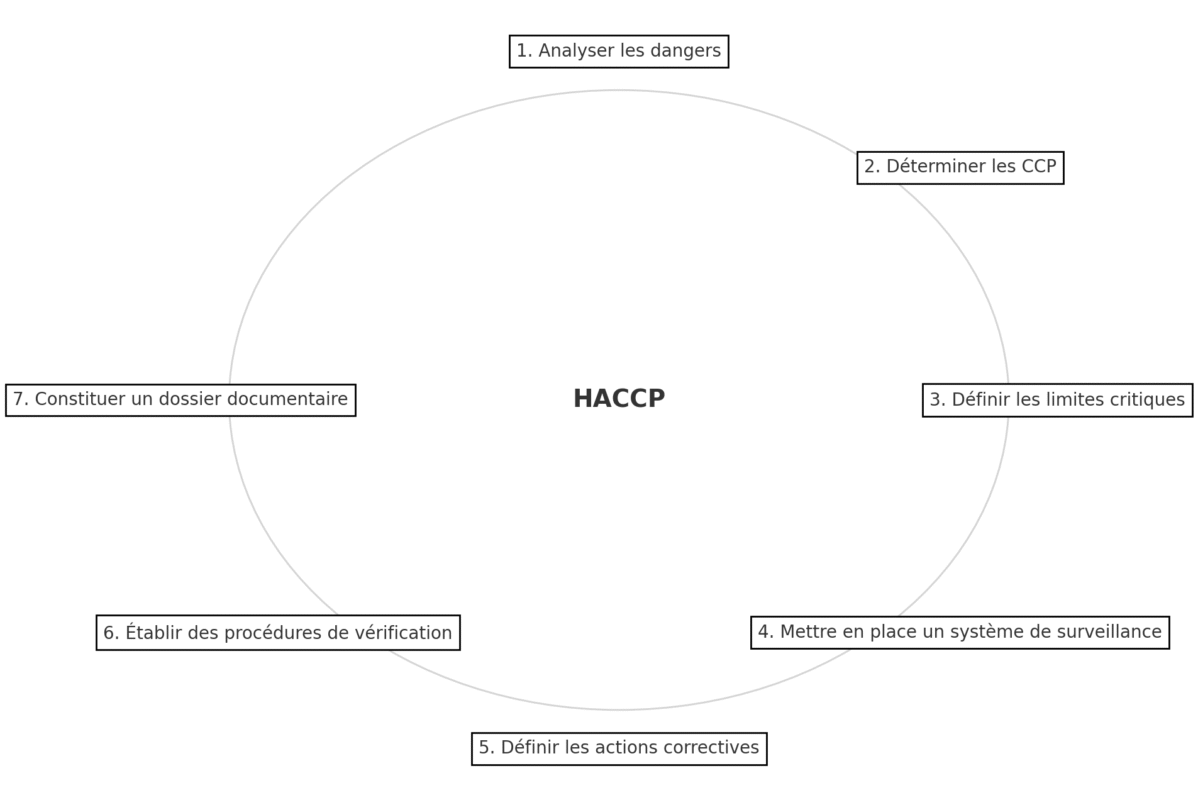 Il y a 7 principes fondamentaux (analyser les dangers, déterminer les CCP, fixer des limites critiques, surveiller, corriger, vérifier, documenter).