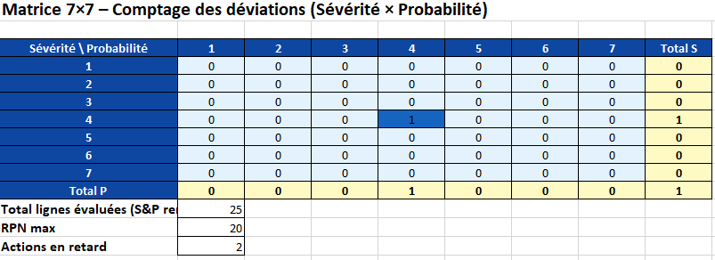 - KPIs : nombre de déviations, actions ouvertes, actions en retard, RPN moyen (si noté), RPN max.