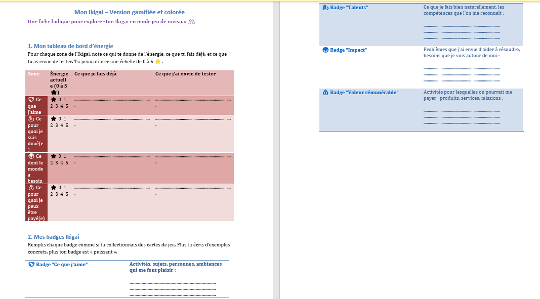 Dans cet article, on va voir comment expliquer l’Ikigai, comment le travailler pas à pas, et comment exploiter plusieurs modèles Word complémentaires : version classique, version tableaux, version gamifiée et carte synthèse A4 paysage.