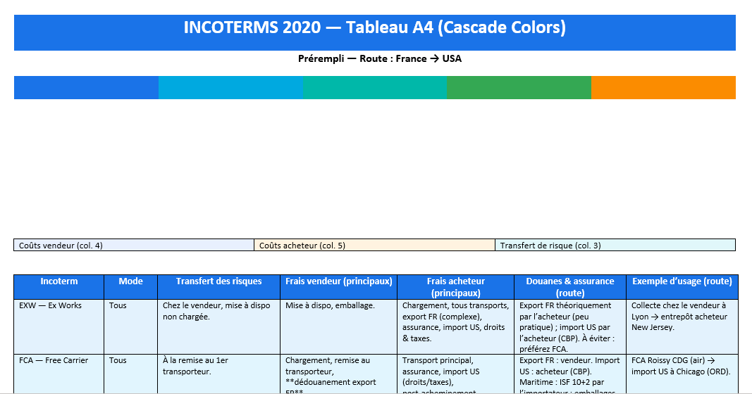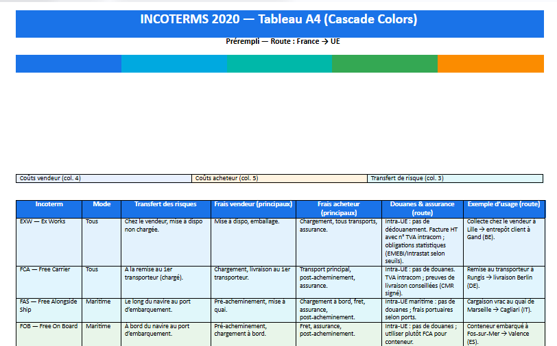 Votre tableau « Incoterms 2020 – Cascade Colors » répond précisément à ces questions, en une page lisible et imprimable. Il rapproche, pour chaque règle, le mode de transport, le point de transfert des risques, la répartition des frais (vendeur ↔ acheteur), les douanes & assurances, et un exemple d’usage. L’objectif : vous aider à choisir l’Incoterm qui soutient votre marge, votre cash et votre qualité de service.