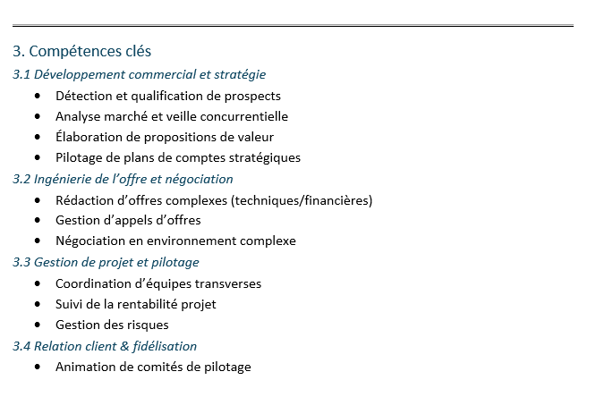 - Compétences commerciales et stratégiques : prospection, négociation, gestion des grands comptes.