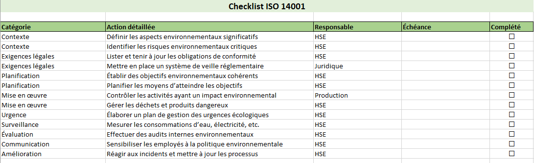 🌿 Checklist ISO 14001 – Système de Management Environnemental