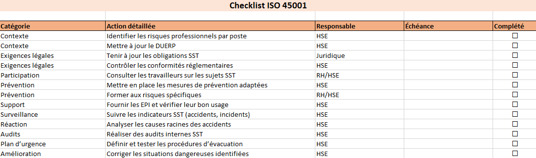 ⚠️ Checklist ISO 45001 – Système de Management de la Santé et de la Sécurité au Travail (SST)