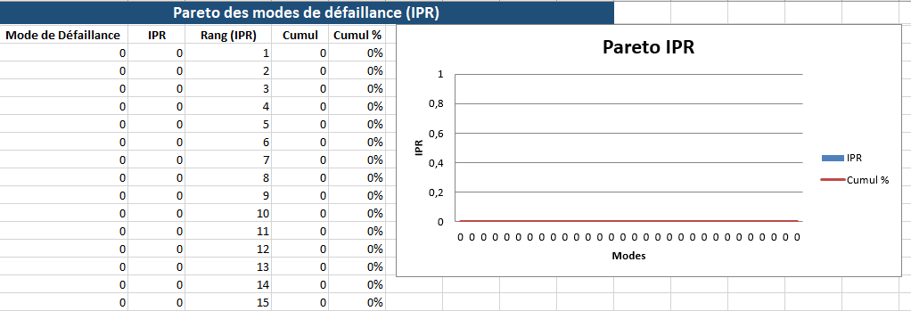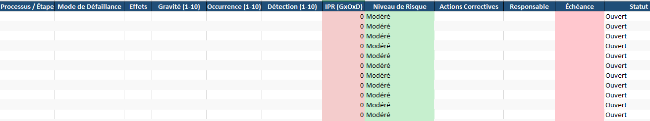 - Structure du tableau : colonnes pour Mode de défaillance, Effet, Cause, Gravité (G), Occurrence (O), Détection (D), calcul automatique de l’IPR (G × O × D).