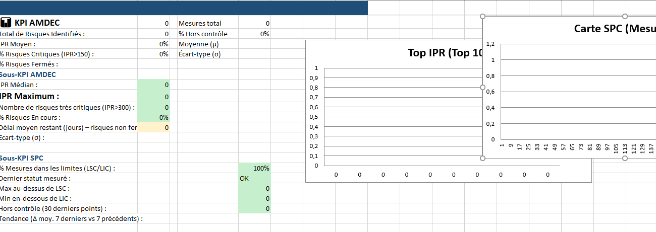 👉 Conclusion managériale : L’outil AMDEC-SPC mis en place dans le fichier Excel fournit une vision claire et hiérarchisée des risques. L’entreprise peut désormais prioriser ses actions, améliorer la détection et renforcer la stabilité du procédé, garantissant ainsi une qualité produit conforme aux exigences automobiles.
