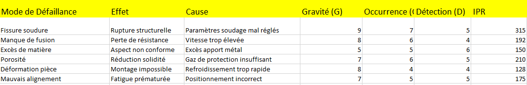 - AMDEC : l’analyse met en avant un risque de fissuration lors du soudage avec un IPR de 280 (critique). Des actions correctives sont planifiées (renforcement du contrôle visuel, formation opérateur).