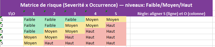 - Rôle : table de lecture 5×5 « Sévérité × Occurrence » → niveau Faible / Moyen / Haut, colorée.