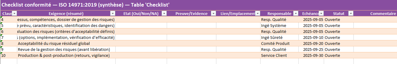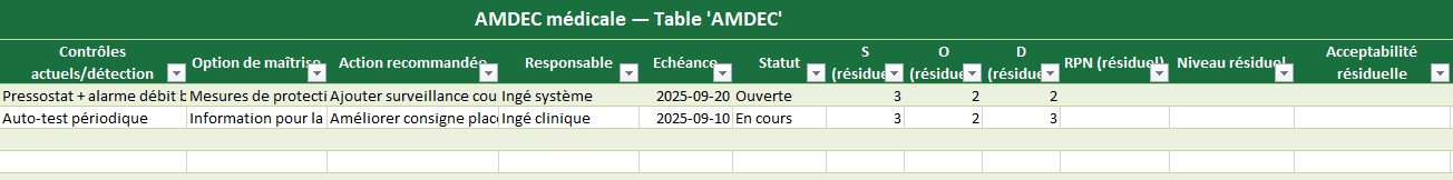 Le classeur fourni « ISO14971_AMDEC_Checklist_FR_v2.xlsx » vous fait gagner du temps :