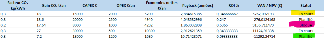 - Règles visuelles : payback ≤ 3 ans en vert, retard en jaune, Bloqué en rouge.