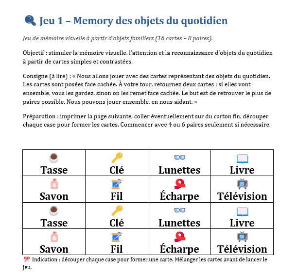 - Jeux de paires / memory imprimé : on imprime des cartes par deux (objets du quotidien, fruits, vêtements, animaux, photos de famille). On retourne les cartes, on cherche les paires. On peut commencer avec 4 ou 6 cartes et augmenter progressivement.