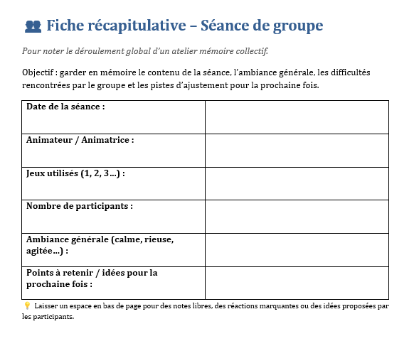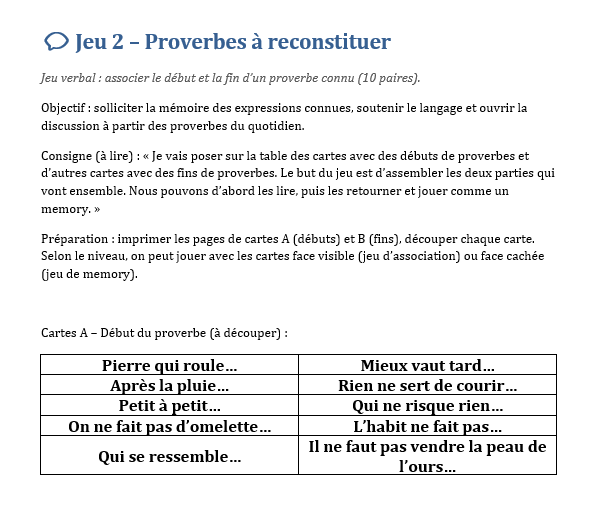 Les jeux gratuits, facilement imprimables, permettent d’organiser des après-midis à thème : souvenirs de cuisine, chansons d’enfance, proverbes, métiers, saisons… Chaque séance devient un prétexte pour faire circuler la parole et pour rappeler à chacun qu’il a encore quelque chose à transmettre.