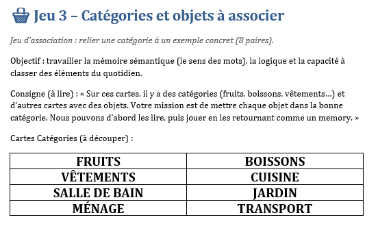 - Classer par catégories : on propose des mots (pomme, pantalon, lait, écharpe) et la personne les range mentalement ou sur papier dans des catégories (fruits, vêtements, boissons…).