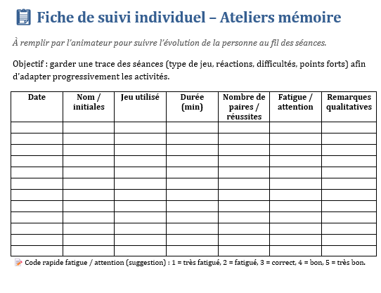 - parfois une petite fiche de suivi pour noter la date, le type de jeu, la durée, le ressenti.