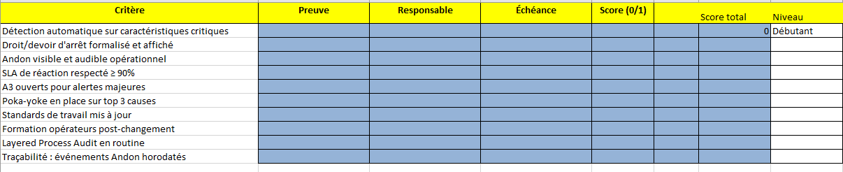 Exemples de critères livrés. Détection auto sur caractéristiques critiques, droit/devoir d’arrêt formalisé, Andon opérationnel, SLA respectés, A3 ouverts sur alertes majeures, poka-yoke en place, standards mis à jour, formation post-changement, LPA en routine, traçabilité Andon.