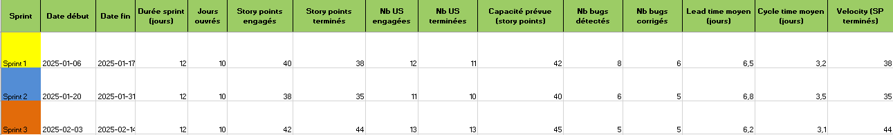 La combinaison d’une feuille de données par sprint, d’un catalogue de KPI documenté et d’une synthèse lisible offre à ton équipe un tableau de bord vivant où les échanges s’appuient sur des faits : capacité de livraison, fiabilité, qualité, temps de traversée.