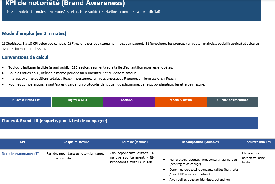 Un bon dispositif de KPI notoriété crée un fil conducteur : exposition → mémoire → intention → préférence. La force du tableau de bord ne vient pas du nombre d’indicateurs, mais de leur cohérence, de la stabilité de la méthode, et de la lisibilité des formules. Avec des familles bien colorées et des calculs décomposés, la notoriété cesse d’être une idée vague : elle devient un actif mesurable, comparable, et actionnable.