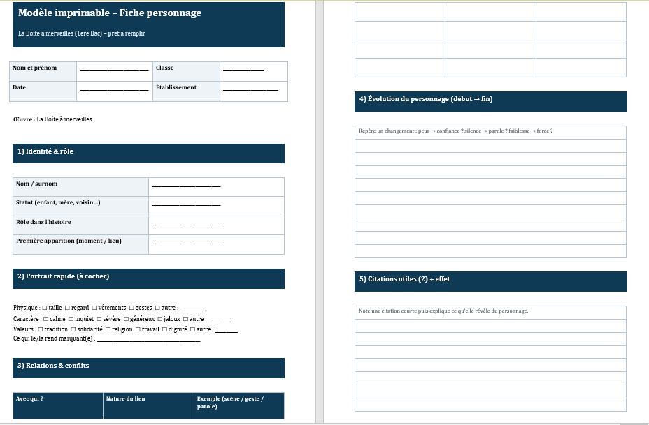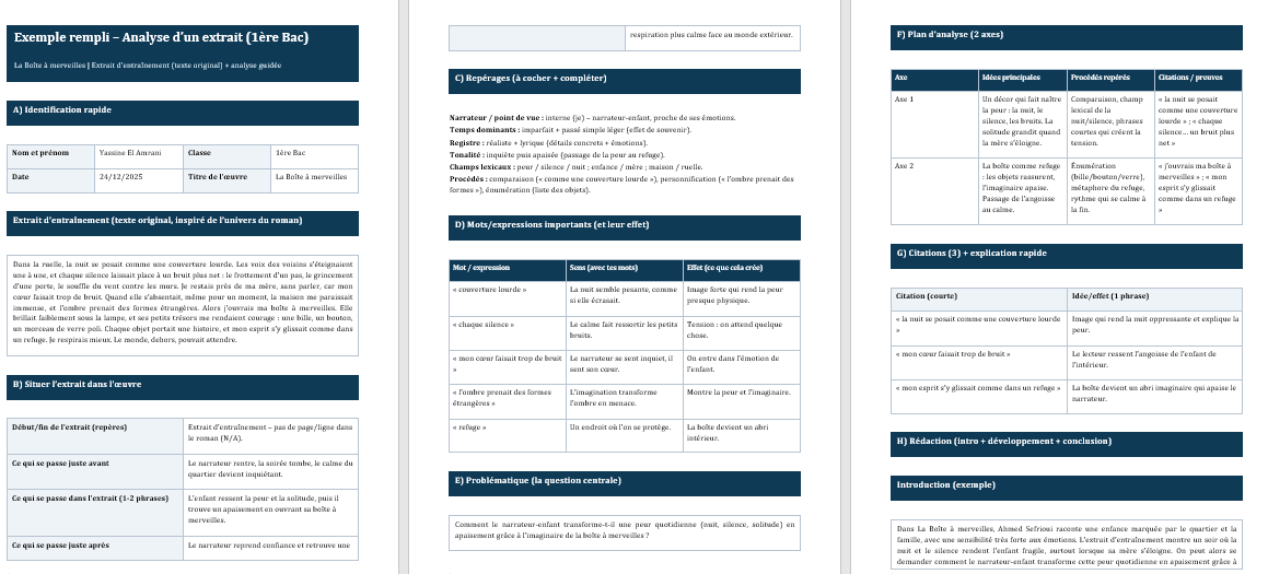 Au lycée, les attentes deviennent plus précises. L’élève doit parler de l’œuvre avec exactitude, et il doit surtout expliquer le sens des scènes : ce qu’elles révèlent sur l’enfance, la peur, la famille, le quartier, les traditions, la pauvreté, l’imaginaire. Une page pilier sert de repère stable, comme un “cahier de bord” enrichi :