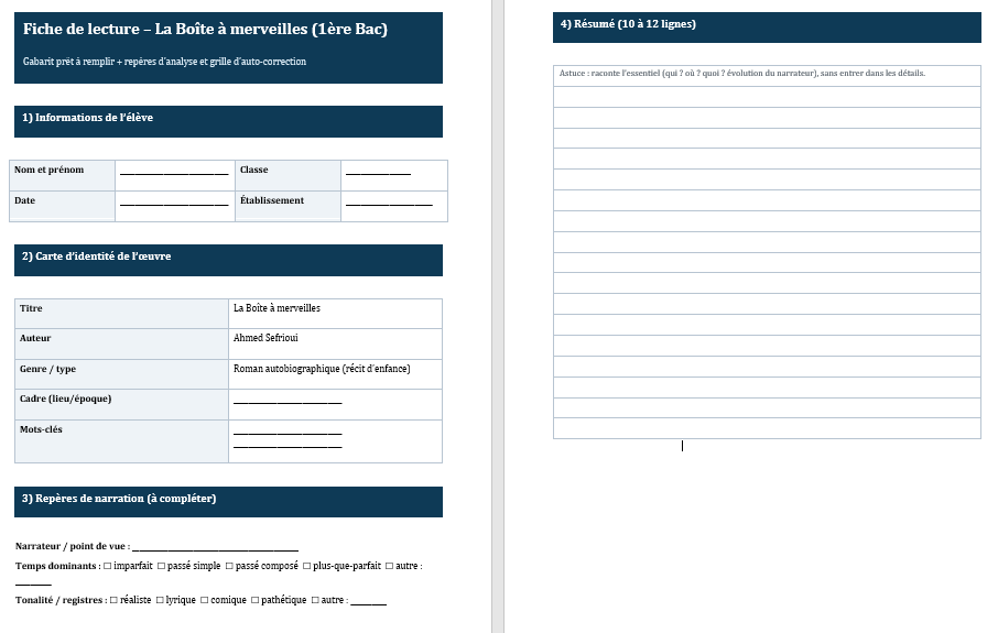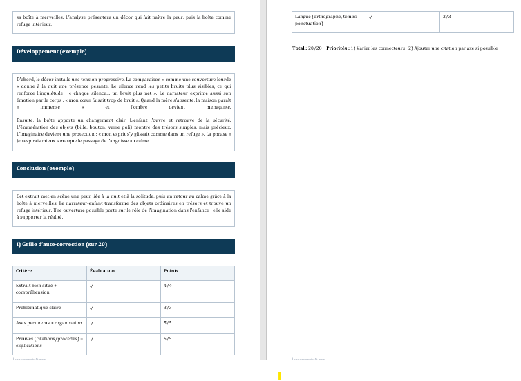 Ce tableau prépare aussi au résumé demandé au lycée : 10 à 12 lignes, avec l’essentiel, sans se perdre. L’élève apprend à sélectionner ce qui compte.