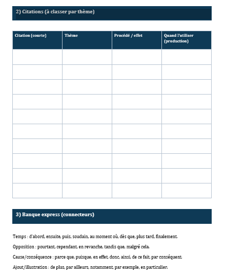 En parallèle, l’élève classe des citations par thèmes. Le jour du devoir, il retrouve rapidement une preuve et il écrit avec plus de précision. Le carnet devient un outil de progression, pas seulement un cahier.
