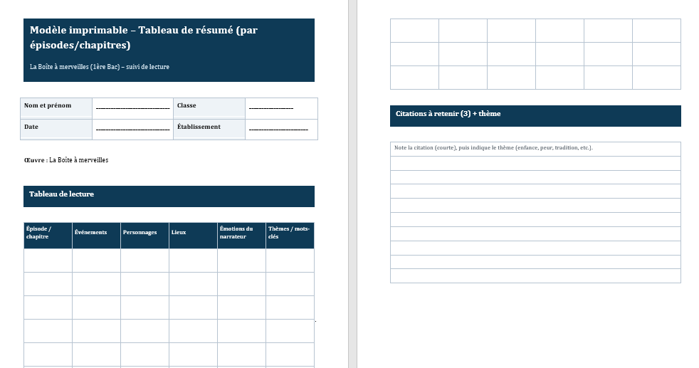 Ce tableau organise la lecture en colonnes : événements, personnages, lieux, émotions, thèmes. Il donne une vision globale. Il facilite énormément la révision, car il suffit de relire le tableau pour retrouver les grands épisodes.