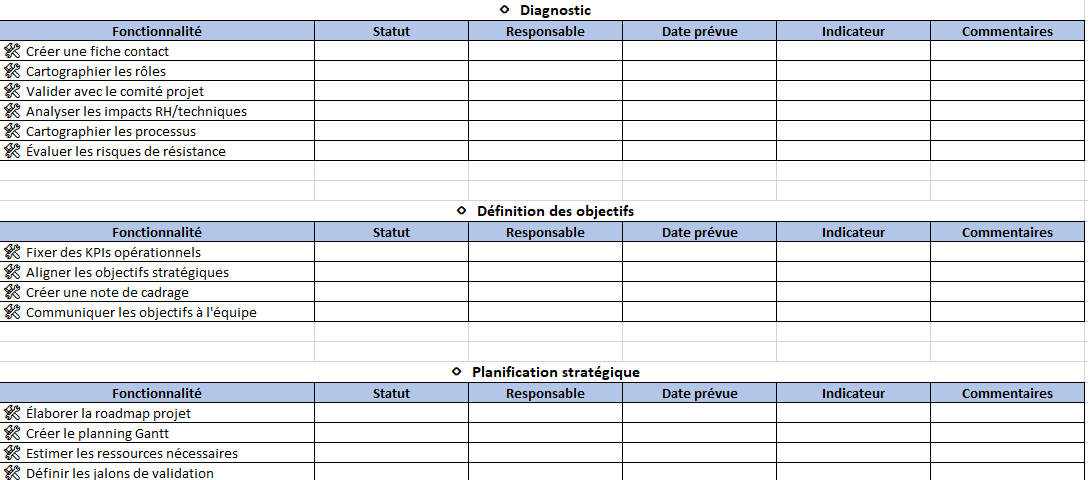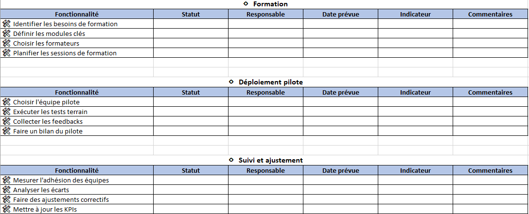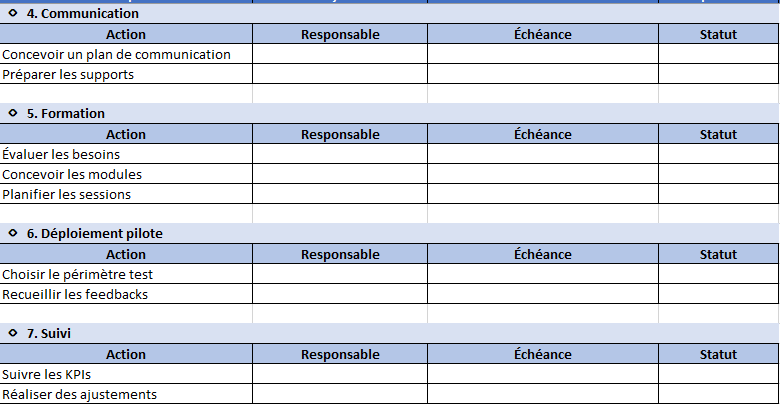 - Évaluer les risques et freins (résistance, manque de compétences, perturbations opérationnelles).