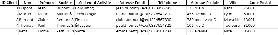 Voici un modèle simple de fiche client dans Excel pour vous aider à commencer. Vous pouvez personnaliser ce modèle en fonction des besoins spécifiques de votre entreprise.