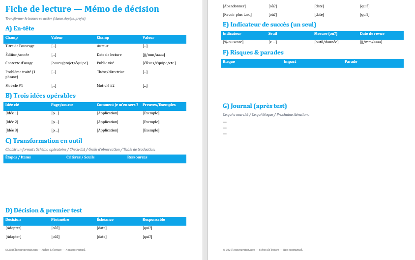 La fiche de lecture n’est pas un résumé : c’est un mémo de décision. Elle capture le minimum utile, transforme l’idée en outil (check-list, schéma, grille), et déploie un petit test daté, mesurable.