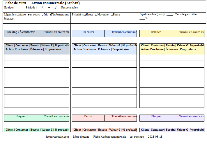 Chaque section contient un tableau ou une structure prédéfinie à remplir.