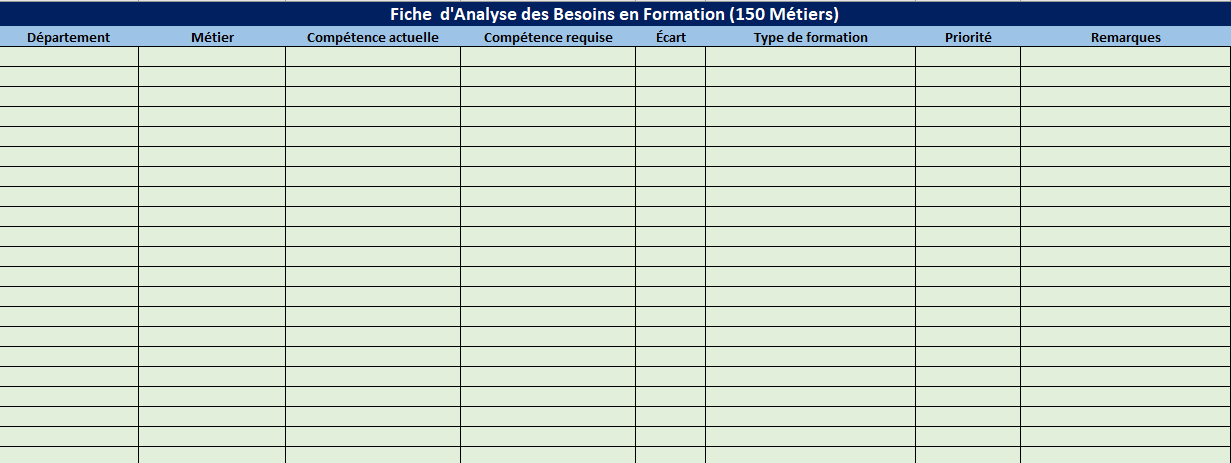 Le fichier Excel conçu est un outil RH stratégique visant à faciliter l’identification, la priorisation et le suivi des besoins en formation au sein de toute organisation, quelle que soit sa taille ou son secteur. Il est conçu pour être à la fois structuré, interactif et personnalisable.