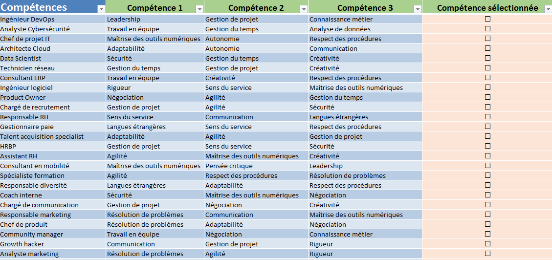 Objectif : Dictionnaire de référence associant chaque métier à ses 3 compétences clés.