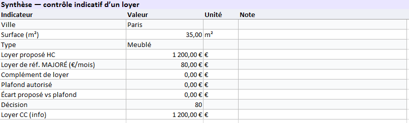 - Bail : loyer de base ≤ plafond, complément = 0 €.